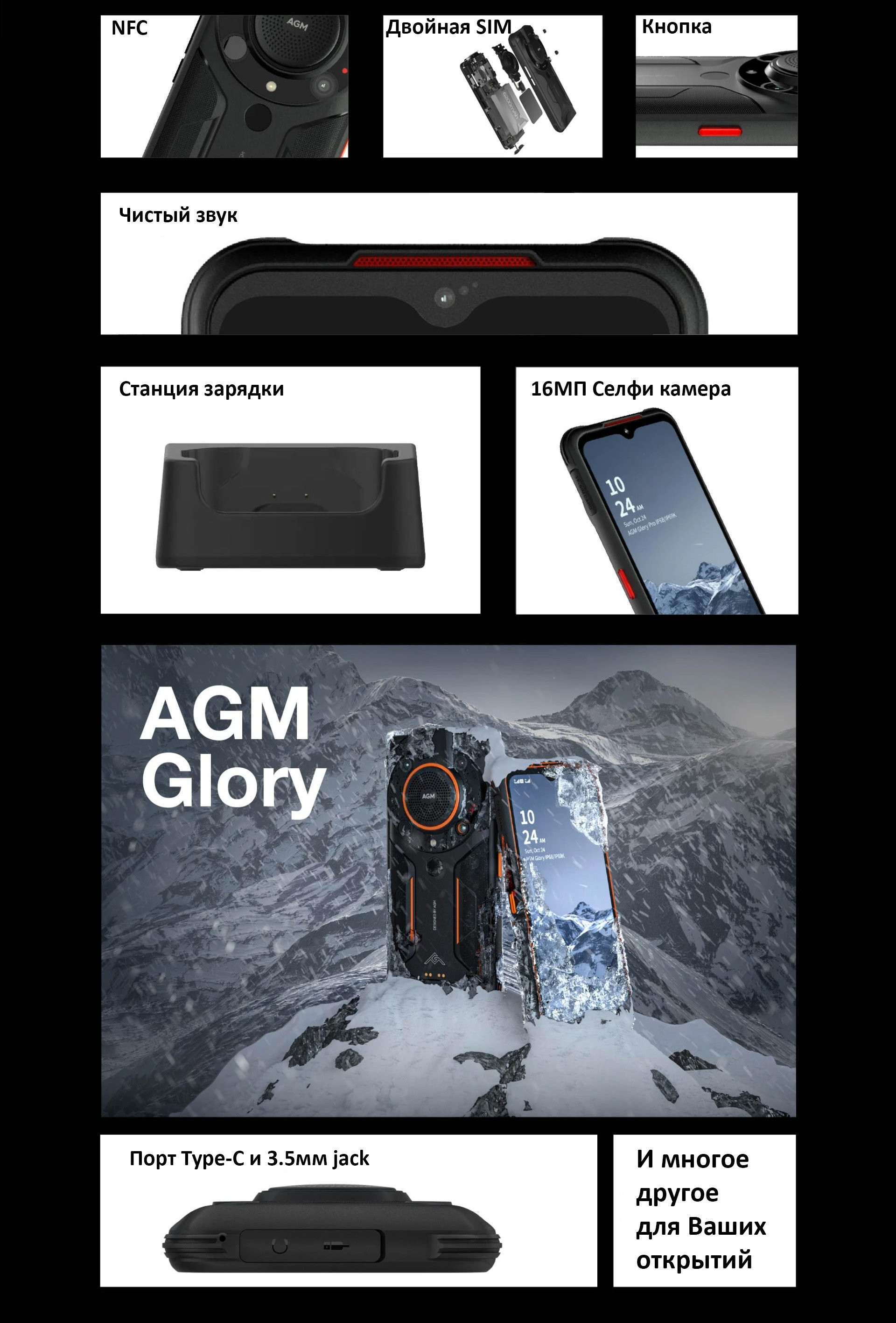 Резюмируя: AGM Glory соответствует IP68, IP69K, STD-810H и стал более пуленепробиваемым.